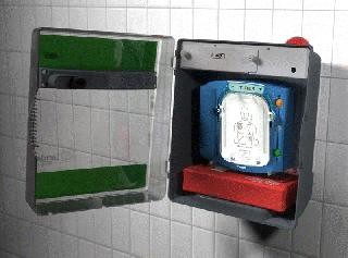 Utanpåliggande larmat skåp i vit plåt för förvaring av hjärtstartare med eller utan väska. Skåpet har ett batteridrivet larm som utlöses när dörren öppnas, skåpet går inte att låsa men larmet aktiveras med en nyckel. |